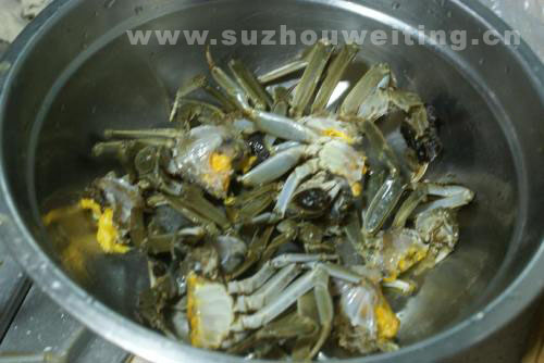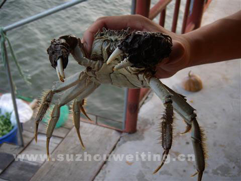 三是金爪:蟹爪金黃,堅實有力,放在玻璃板上,八足挺立,雙螯騰空,臍背隆起,威風(fēng)凜凜。陽澄湖大閘蟹蟹爪近似上等煙絲的金黃色,故又名金爪蟹,而普通螃蟹常與泥漿接觸,則呈灰褐色。陽澄湖大閘蟹的“金爪”,也是陽澄湖得天獨厚的自然環(huán)境賦予它的,螃蟹在湖底爬行,爪子常插入黃泥砂礫,常踩踏水草,這不僅比常在松軟的泥漿中爬行潔凈得多;而且由于湖底堅硬、平坦,宛如一個天然運動場,蟹在上面爬行,自然就練出了與其魁梧身材相稱的堅強有力的爪子。