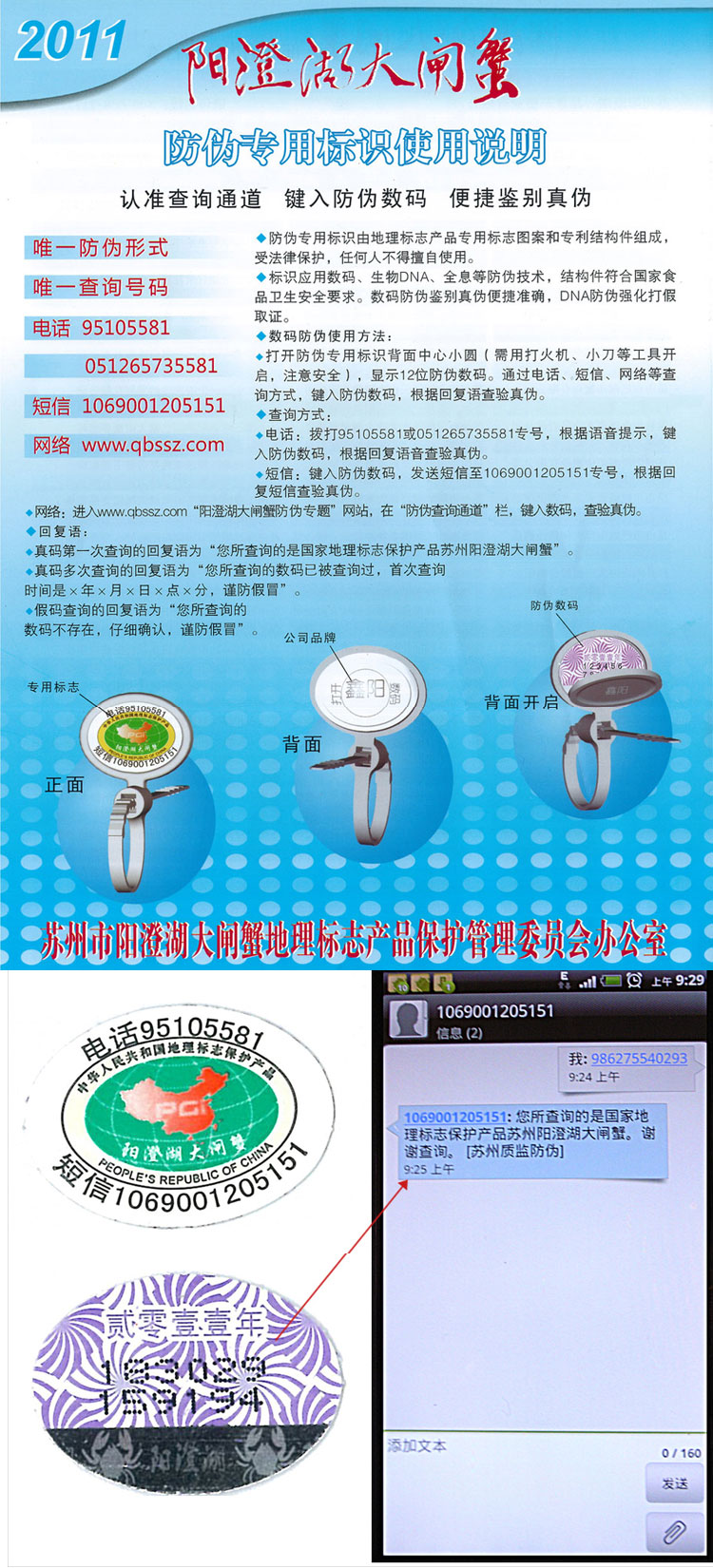 每一年陽澄湖大閘蟹都會(huì)采用“新款”戒指,鎖扣顏色都會(huì)有所改變,一旦鎖住了便無法正常打開,打開防偽標(biāo)識(shí)背面中心小圓,既顯示12位防偽數(shù)字,可通過撥打陽澄湖大閘蟹專用查詢號(hào)95105581查詢真?zhèn),或通過短信平臺(tái)1069001205151查詢真?zhèn)危樵兘Y(jié)果如上圖所示。