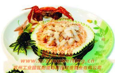 5、將提前制好的蟹鉗肉放入齒輪冬瓜內(nèi),用白米蝦肉圍上一圈,上籠旺火蒸一分到兩分鐘即可。