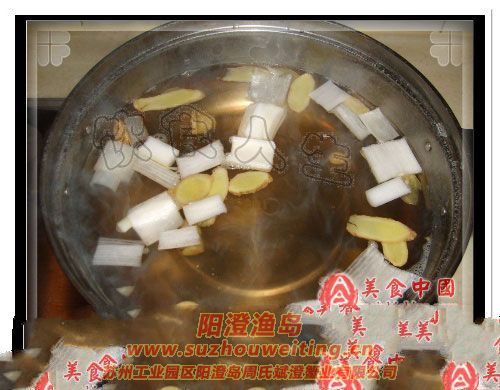 調(diào)制料湯,蔥段,蒜姜片,枸杞子,料酒,黃酒,雞精,大量的鹽,一起燒開后放涼, |